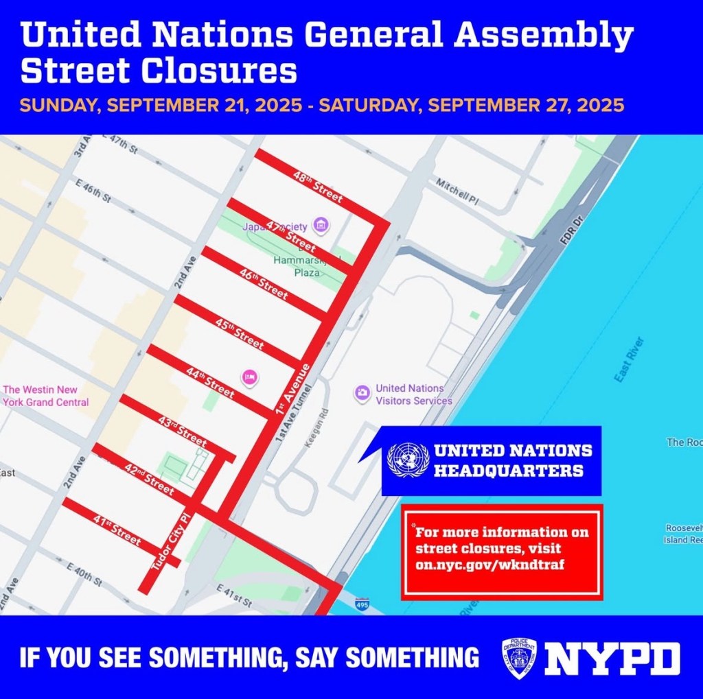 - Cierres propuestos en varias calles principales, especialmente alrededor de First Avenue entre 34th y 63rd Streets, y en tramos del FDR Drive cercanos a la sede de la ONU.