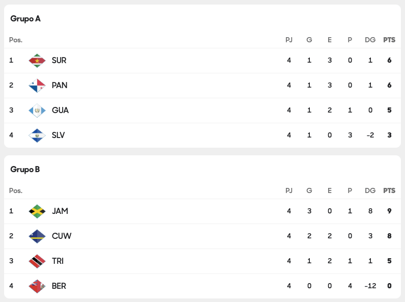 - Equipos con rendimiento débil en esta fase (por ejemplo, Bermuda en el Grupo B) tienen pocas expectativas de avanzar. Bermuda perdió 0-4 ante Jamaica y aparece con saldo negativo de goles.