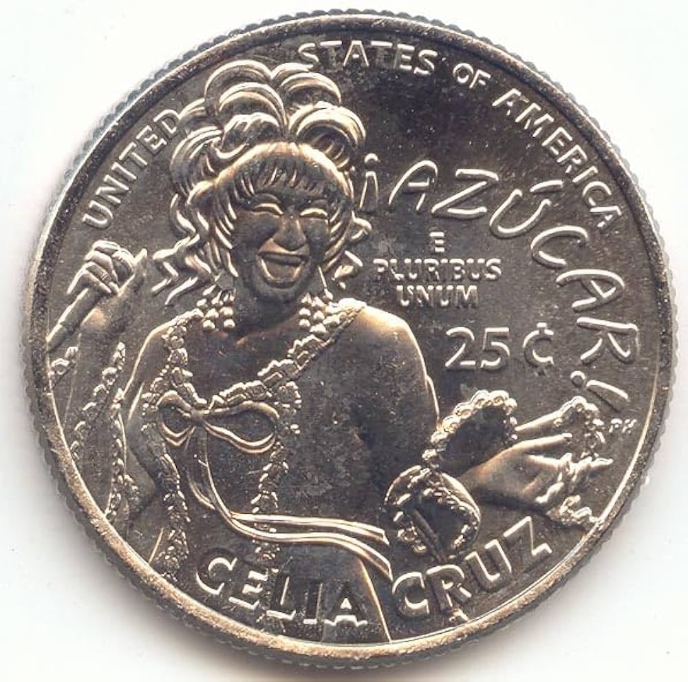 - Diseño del reverso: Retrato de Celia Cruz con vestido estilo rumba, micrófono en mano y su célebre lema “¡AZÚCAR!” inscrito. También aparecen “UNITED STATES OF AMERICA”, “E PLURIBUS UNUM”, “25¢” y “CELIA CRUZ”.