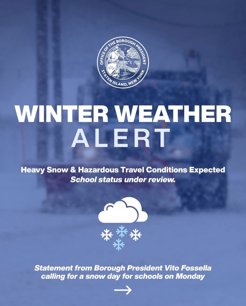 “Un día de nieve tradicional es la mejor opción para garantizar la seguridad de los niños y sus familias. Si no se puede declarar un snow day, entonces las escuelas de Staten Island deberían estar en aprendizaje remoto, pero esta decisión debe tomarse ahora, no esperar hasta mañana domingo,” dijo Fossella en su pedido público.